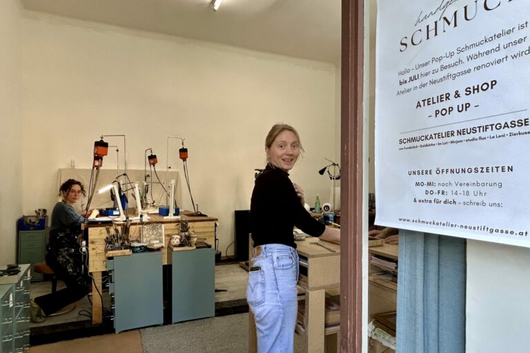Sechs junge Schmuckkünstlerinnen arbeiten für drei Monate in einem Ausweichquartier beim Augarten. Das Atelier ist winzig, das WC weit weg, doch sie schwärmen von der Camping-Atmosphäre.