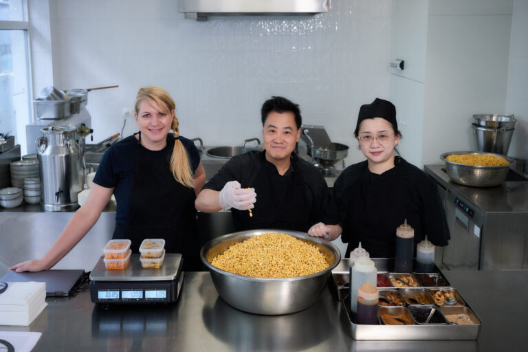 In einem kleinen Marktstand wird Biogemüse nach den Lehren der Traditionellen Chinesischen Medizin zu Mittagsmenüs verarbeitet.
