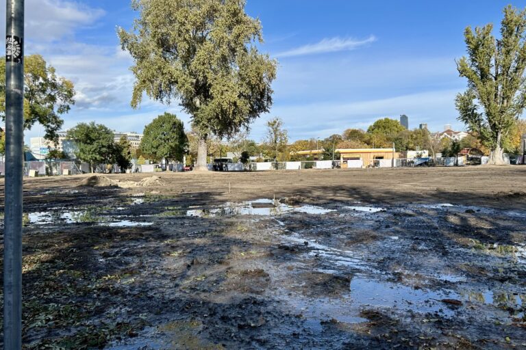 Am nördlichen Ende des Augartens sollte ein städtebauliches „Leuchtturmprojekt“ mit 200 Wohnungen und viel Grün enstehen. Nun ist die Baufirma in Konkurs und das Gelände liegt brach.