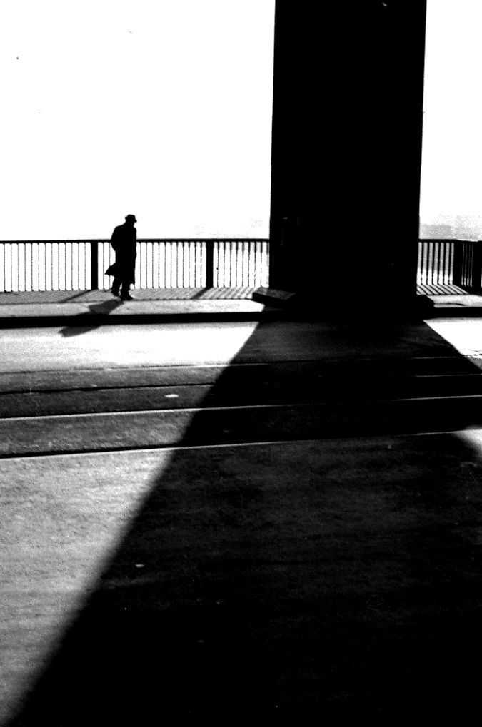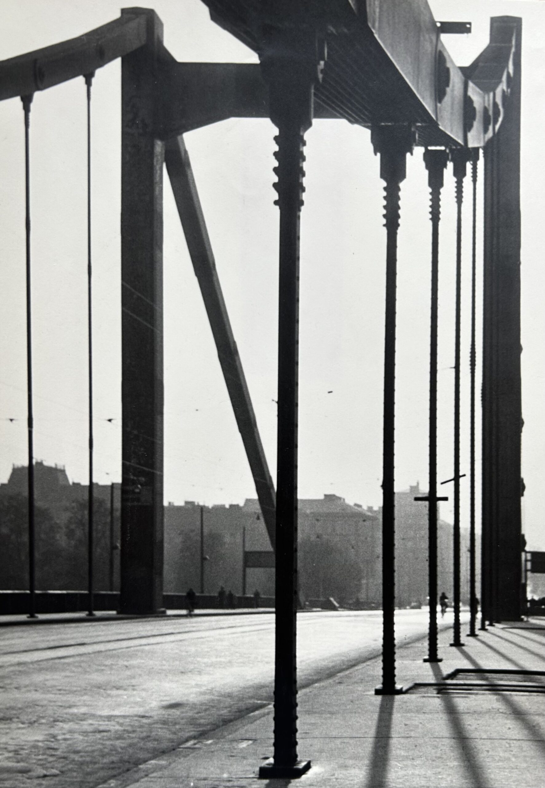 Die Reichsbrücke war im Krieg nur leicht beschädigt worden, wurde schnell wieder hergestellt und bekam von den Sowjets den Namen „Brücke der Roten Armee“. Die Schattenspiele der mächtigen Pfeiler der Hängebrücke faszinierten Herbert Grünwald so sehr, dass er dort häufiger fotografierte.