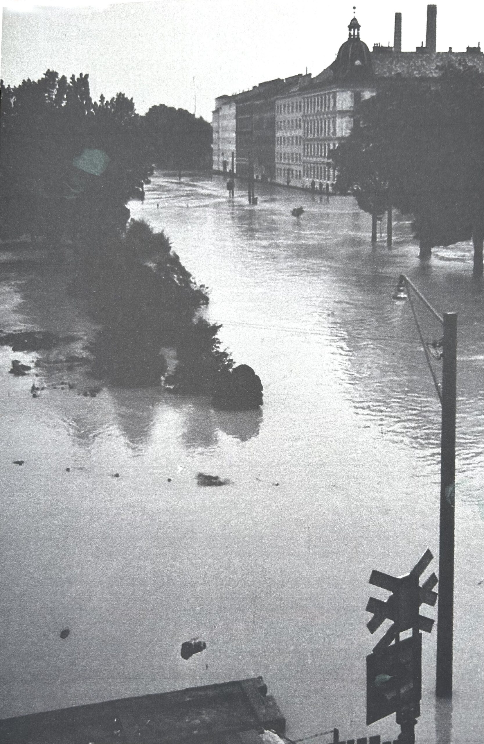 Von der Reichsbrücke aus machte er im Juli 1954 auch ein Foto vom überschwemmten Handelskai. Nach heftigen Regenfällen konnte das Inundationsgebiet die Wassermassen nicht aufnehmen. Die Donau überschwemmte auf dem rechten Ufer den Handelskai, die Bahn und die Engerthstraße.