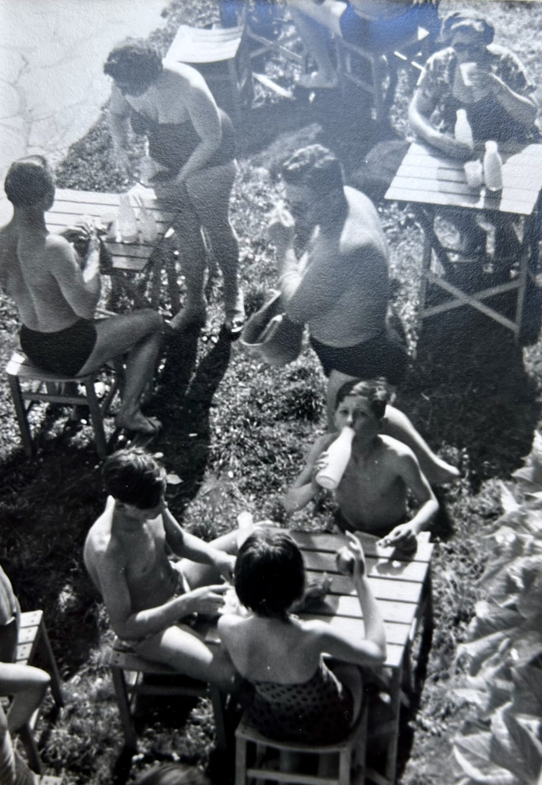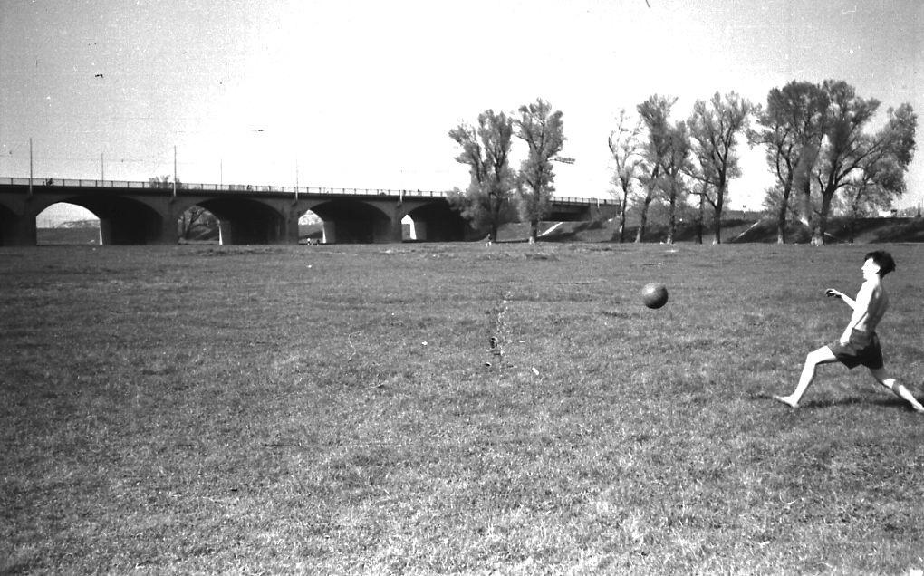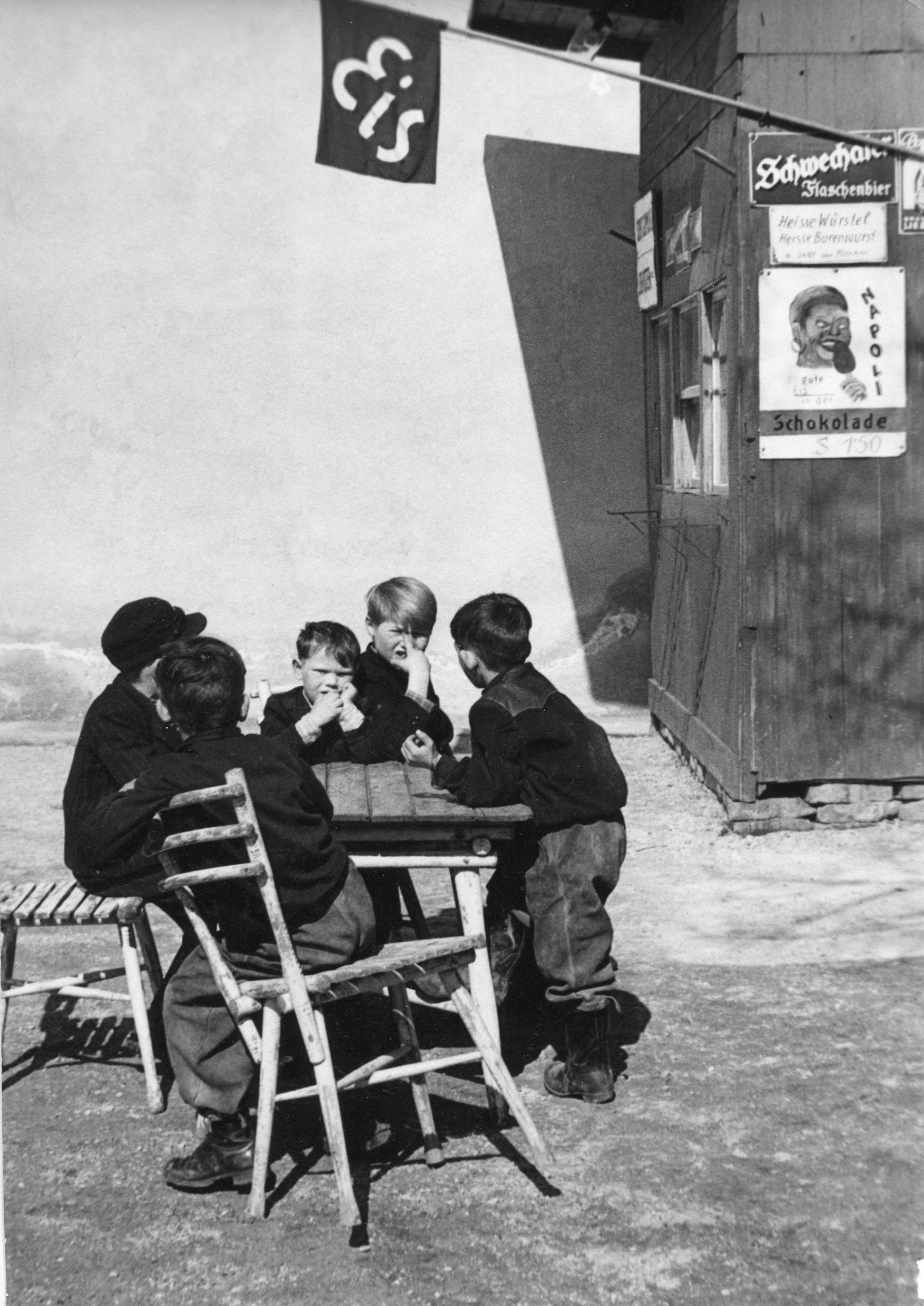 Über die Reichsbrücke gelangten die Leopoldstädter auf das riesige Überschwemmungsgebiet am linken Donauufer, „Inundationsgebiet“ genannt. Für Jugendliche und junge Erwachsene wie Herbert Grünwald war das ein wunderbarer Platz zum Fußballspielen, oder einfach um im Gras liegen und nichts zu tun. Bald nach Kriegsende entstanden hier einfache Gasthäuser und Bretterbuden, in denen die Kinder Eis kaufen konnten. Grünwald hat sie dabei fotografiert.