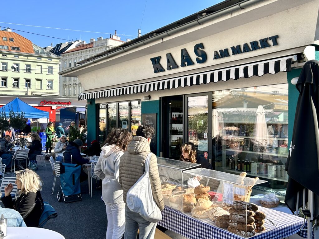 Mit diesem Knowhow habe ich am Karmelitermarkt einen Marktstand übernommen und zum Kaas am Markt ausgebaut. Die Grundidee: Die Bauern stehen nur samstags am Markt, mir können sie aber jeden Tag ihre frischen Produkte liefern. Damit wird jeder Tag zum Markttag. Bald hatte ich ein wunderbares, überwiegend regionales Angebot in unseren Vitrinen. Als Feinkosthändlerin durfte ich auch acht Sitzplätze einrichten, um dort Gäste zu bedienen.