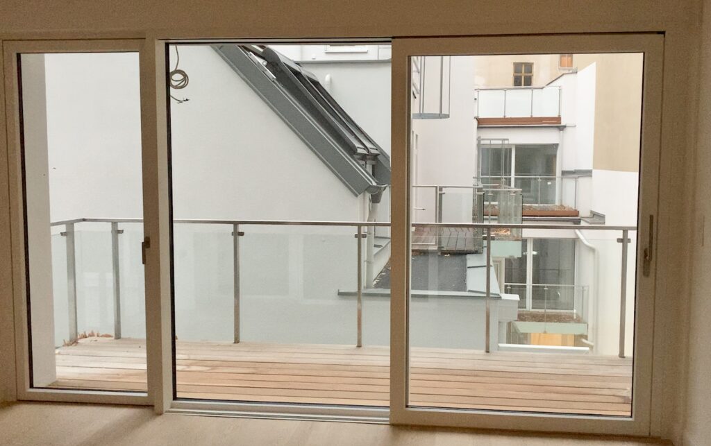 Langer Gang, rechts die Wohnküche, hinten ein Schlafzimmer und ein kleines Kinderzimmer. Die Decken sind – typisch Neubau – mit einer Höhe von 250 cm niedrig. Die bodentiefe Fenster bringen viel Licht, aber direkt davor liegt die nächste Wohnung. Leise surrt die Wärmepumpe im Hof.