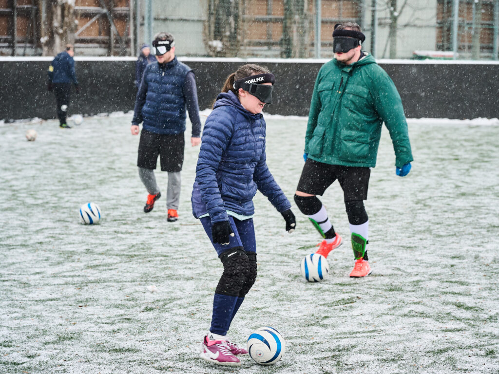 „Jeder Sehende kann irgendwo um die Ecke in einen Verein gehen oder im Käfig kicken. Und wir können das halt nicht.“ Das dachte sich die schwer sehbehinderte Bettina Sulyok noch vor ein paar Jahren. Heute steht die 50-jährige mit Fußballschuhen im Schneetreiben am Sportplatz Hopsagasse.