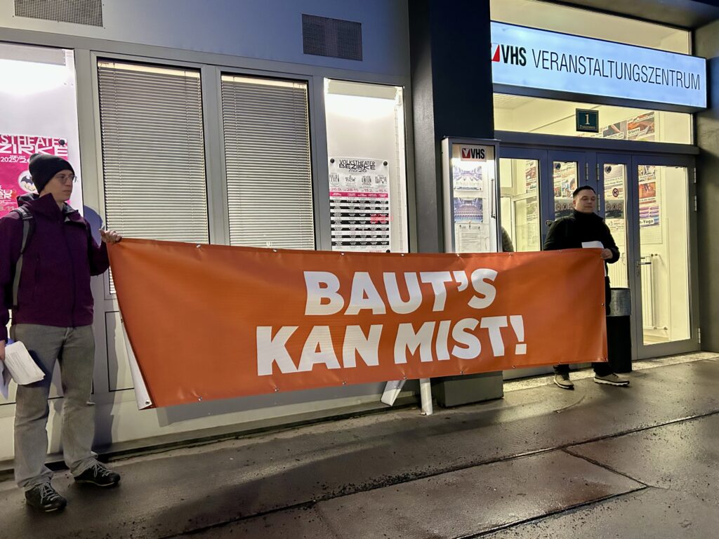 Offenbar betrachtet die Gemeinde Wien das Thema als besonders sensibel oder fürchtete Aktionen der Mistplatz-Gegner. Die standen vor Beginn der Veranstaltung tatsächlich vor dem Eingang – mit einem Transparent, auf dem sie die Politik aufforderten: „Baut’s kan Mist!“ Dazu verteilten sie Flugblätter, in denen kritisiert wird, dass es „viele Fragen und keine Antworten“ gebe. Die zweistündige Diskussion im Saal verlief dann sehr zivilisiert und ganz ohne Eklat.