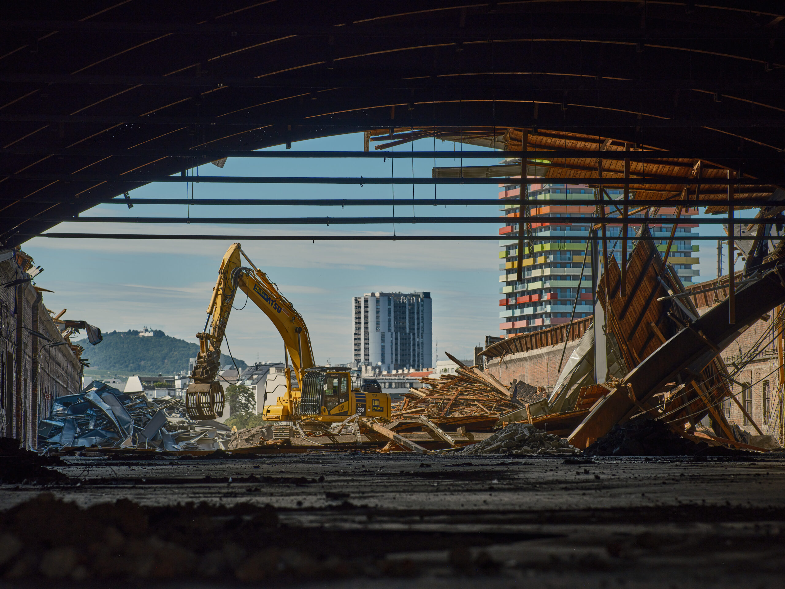 Zwischenbrücken-Fotograf Christopher Mavrič hat von den ÖBB die Erlaubnis erhalten, die Abbrucharbeiten direkt auf der Baustelle zu dokumentieren – und zwar nicht nur vom Boden aus, sondern auch mit einer Drohne. Mit dieser konnte Mavrič das Geschehen nicht nur aus der Vogelperspektive dokumentieren, sondern auch in das Innere der historischen Hallen fliegen, kurz bevor die Bagger sie zu Haufen aus Ziegel, Holz und Metall zerkleinerten.