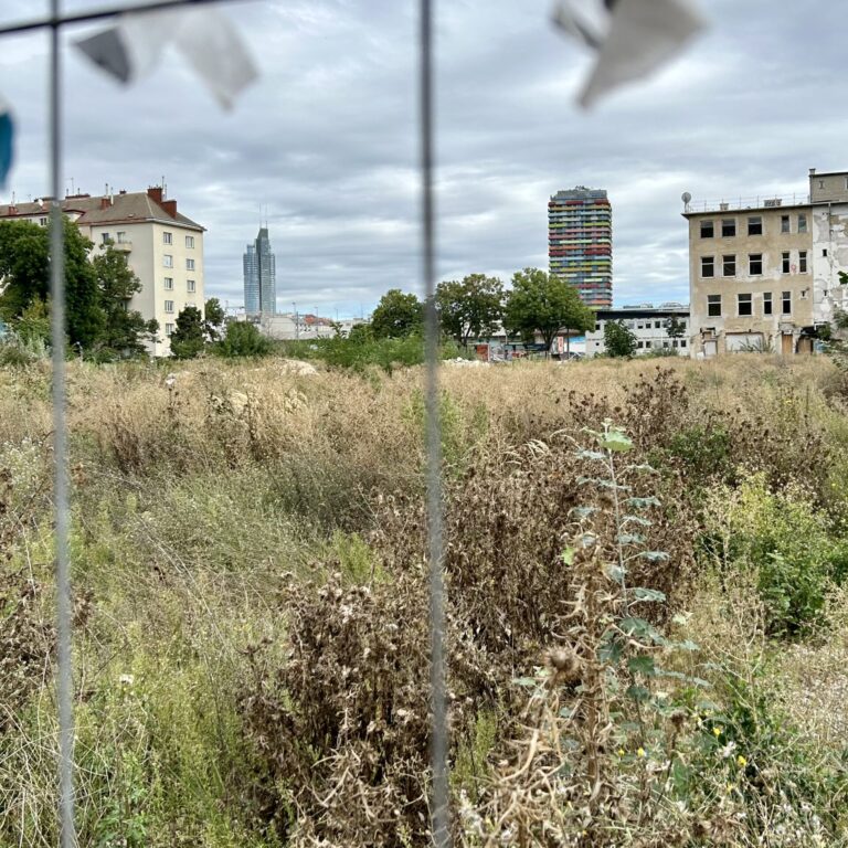 Am nördlichen Ende des Augartens sollte ein städtebauliches „Leuchtturmprojekt“ mit 200 Wohnungen und viel Grün enstehen. Nun ist die Baufirma in Konkurs und das Gelände liegt brach.