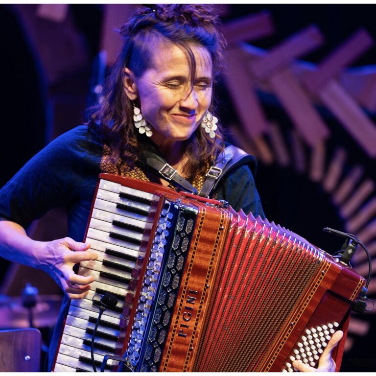 Die Kulturarbeiterin und Musikerin Franziska Hatz, 46, beamt mit ihrem Akkordeon tonnenweise Energie aus der Brigittenau in alle Welt.